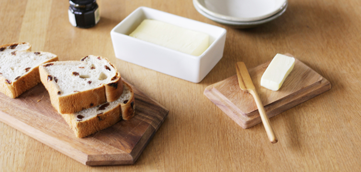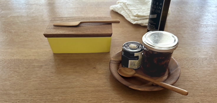 パンにはやっぱりバター。買ってきたバターはバターケースに入れ替えて保存。200gのバターがおさまるサイズです。そのまま冷蔵庫から出しても様になります。こんなふうに木蓋をバタートレイにして。