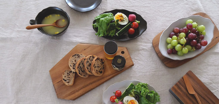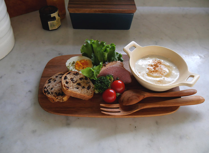 カッティングボードにもトレイにもなるウッドボード。忙しい朝に嬉しいアイテムです。ひとつにまとまっているとカフェっぽくて気分も上がりますし、家族の朝食時間がバラバラな時もボードに用意しておけば、それぞれで運べて便利。
