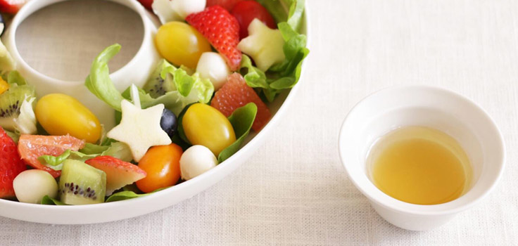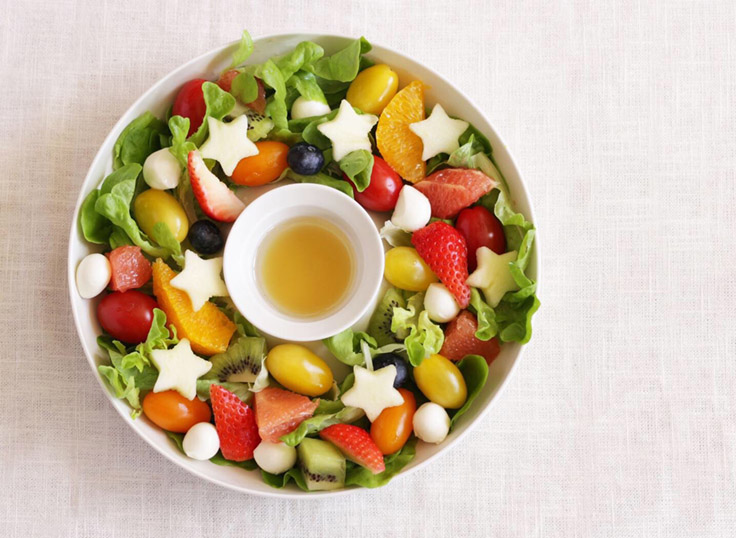 きらきらサラダ。フルーツもいれてカラフルに。りんごは星型に抜いてみました。ドーナツ型のプレートでカップが収まります。真ん中が空いているおかげで盛りすぎても可愛らしく見えるのも良いところ。盛り付けが楽しくなるプレートです。